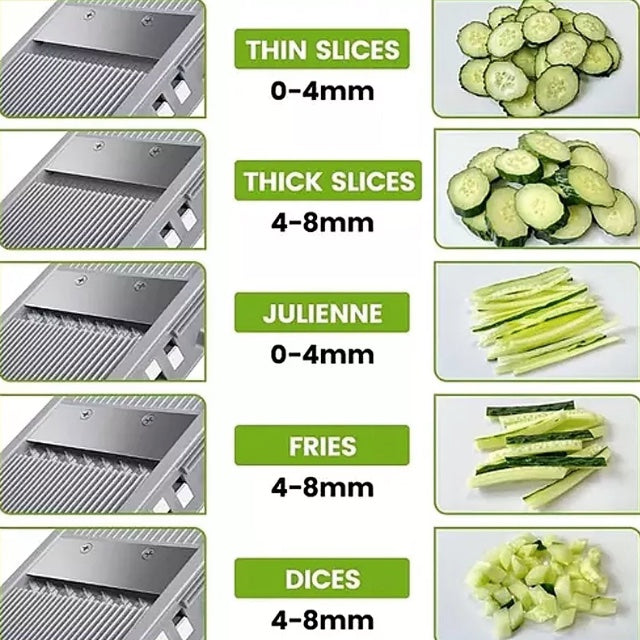 Ajuste de Espesor: Personaliza el grosor de tus cortes con el ajuste de espesor incorporado. Logra la textura perfecta para cada receta, desde papas fritas crujientes hasta rodajas finas para ensaladas.